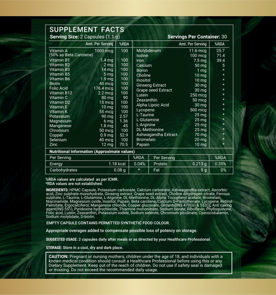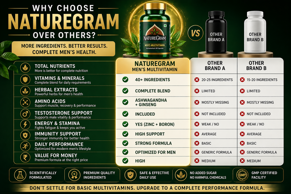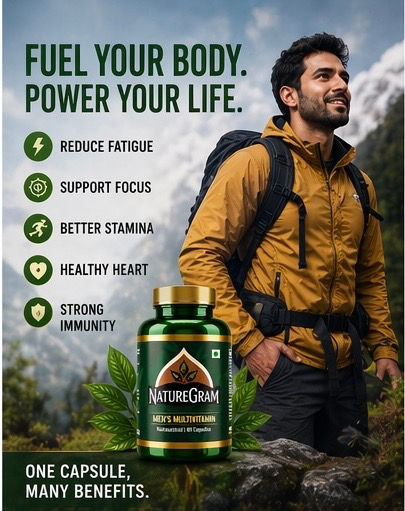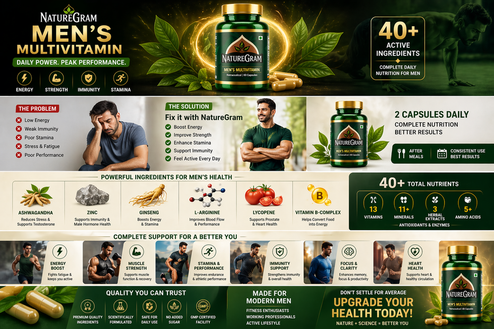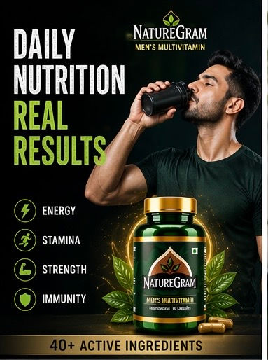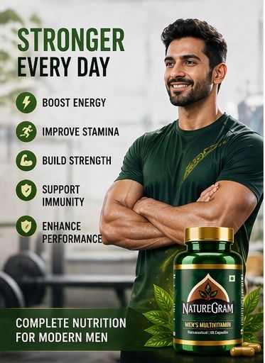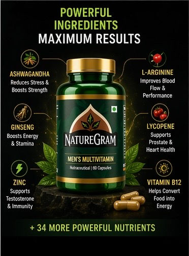 Enriched with ingredients like Ashwagandha, Ginseng, and Grape Seed Extract, this advanced formula supports energy levels, immunity, stamina, and overall well-being. Whether you are managing a busy work schedule or an active lifestyle, NatureGram ensures your body gets the right balance of nutrients every day.